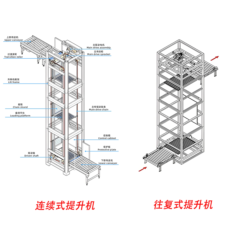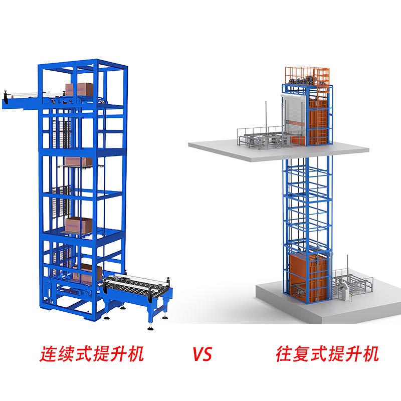 連續(xù)式提升機(jī)和往復(fù)式提升機(jī)是自動(dòng)化物流系統(tǒng)中常見(jiàn)的垂直輸送設(shè)備,但它們?cè)诮Y(jié)構(gòu)、效率、適用場(chǎng)景等方面存在顯著差異。本文將從多個(gè)維度進(jìn)